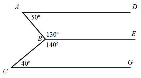 + `hat(DAB)+hat(ABE)=50^o + 130^o= 180^o`