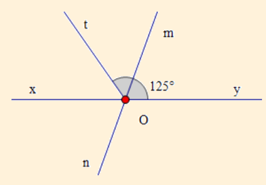 Hai đường thẳng `xy` và `mn` cắt nhau tại `O`. vẽ tia phân giác `Ot` của góc `hat(xOm)`. Biết `hat(yOt)=125^o`.
