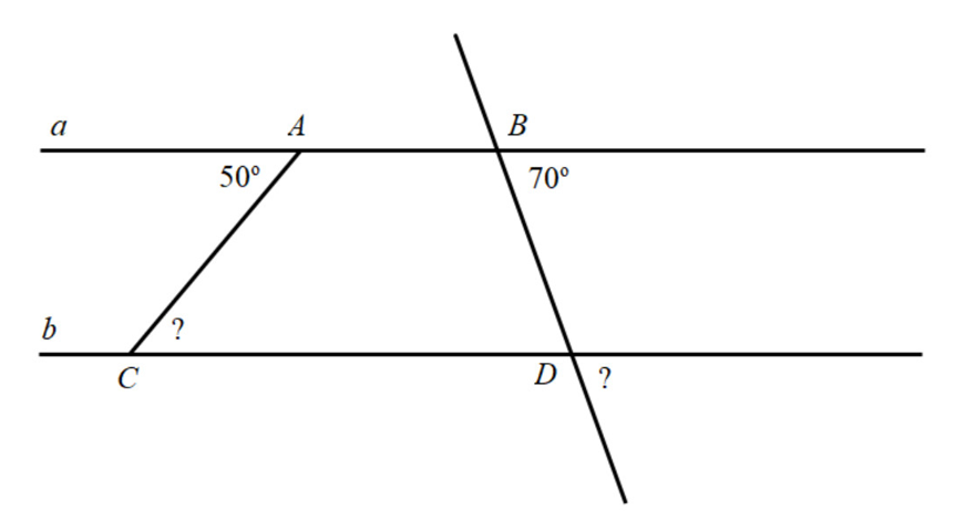 Cho hình vẽ sau biết `a////b, hat A=50^o,hatB=70^o.` Tính số đo góc `hatC;hatD`