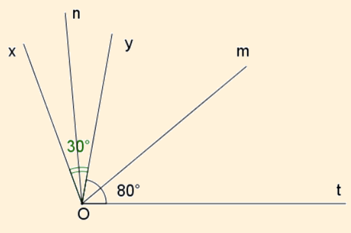 Cho hai tia `Ox,Oy` cùng nằm trên nửa mặt phẳng có bờ chứa tia `Ot`. Biết `hat(tOy)=80^o,hat(xOy)=30^o` và tia `Oy` nằm giữa hai tia `Ox` và `Ot`. Gọi `On` là tia phân giác của góc `hat(xOy)`, `Om` là tia phân giác của `hat(tOy`. Số đo của góc `hat(mOn` là: