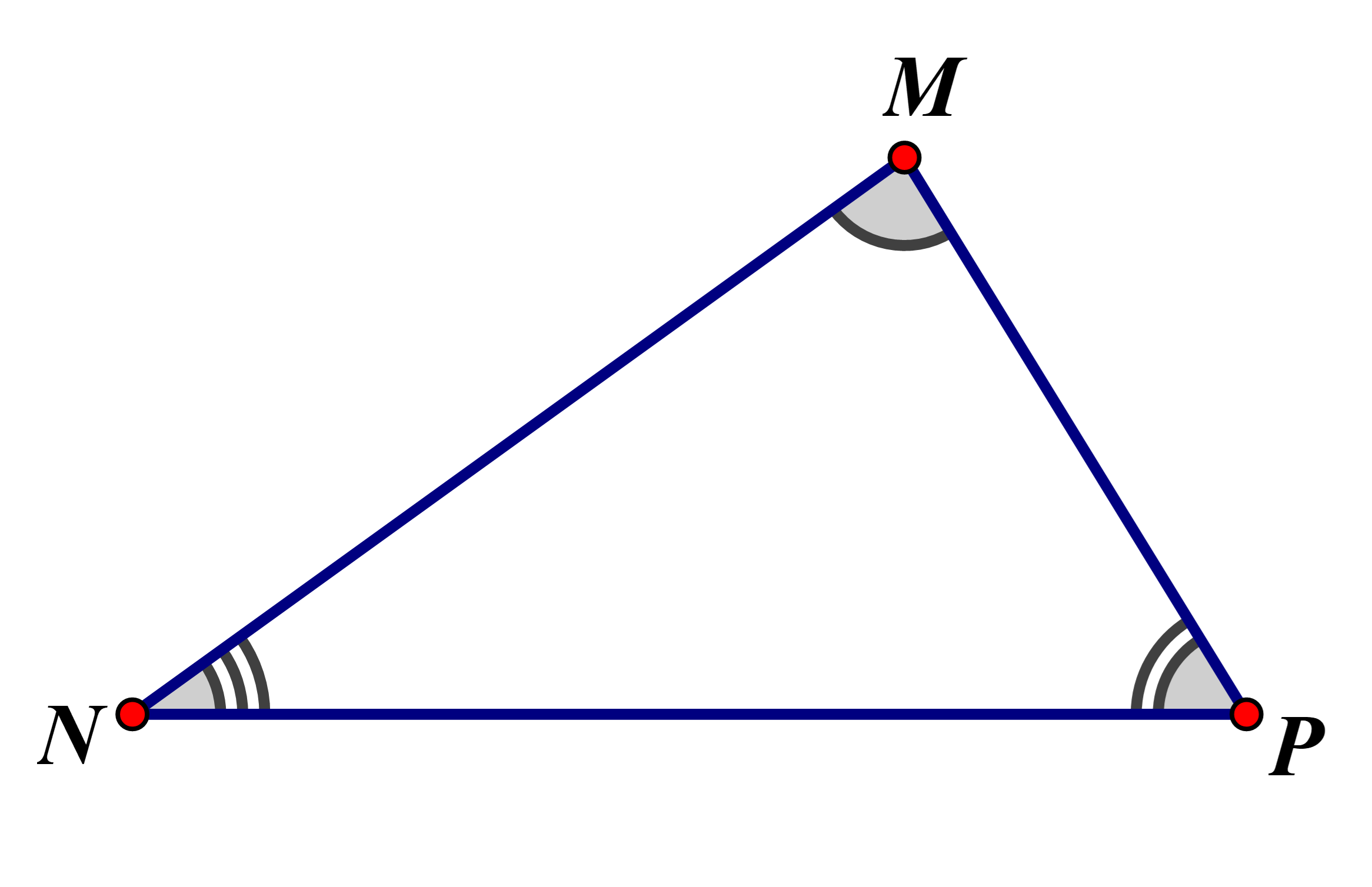 Mà các cạnh đối diện với các góc `\hat(N);\hat(P);\hat(M)` lần lượt là `MP;MN;NP`