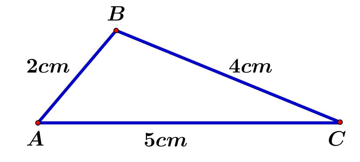 Bộ ba độ dài `3` `cm`; `4` `cm`; `5` `cm` có thể là ba cạnh của một tam giác vì `5 < 3+4` (Hoặc `3 > 5-4`)