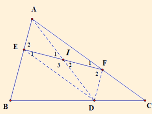 Cho tam giác `ABC`, điểm `D` thuộc cạnh `BC`. Kẻ `DE` // `AC` (`E` thuộc `AB`), kẻ `DF` // `AB` (`F` thuộc `AC`). Gọi `I` là trung điểm `EF`. Khi đó `I` là trung điểm của `AD` là đúng hay sai?