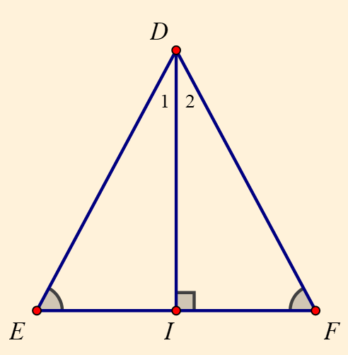 Cho tam giác `DEF` có `hatE=hatF`. Vẽ `DI` vuông góc với `EF` (`I` thuộc `EF`). `△DIE=△DIF` bằng nhau theo trường hợp gì của tam giác vuông?