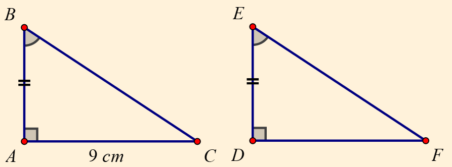 Cho tam giác `ABC` và tam giác `DEF` có `AB=DE,hatB=hatE,hat A=hatD=90^o`. Biết `AC = 9cm`. Độ dài `DF` là: