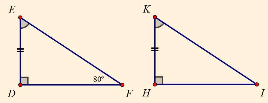 Cho tam giác `DEF` và tam giác `HKI` có `hatD=hat H=90^o,hatE=hatK,DE=HK`. Biết `hatF=80^o`. Số đo góc `I` là: