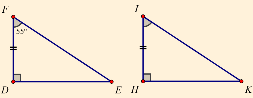 Cho tam giác `DEF` và tam giác `HKI` có `hatD=hat H=90^o;hatF=hatI;DF=HI`. Biết `hat F=55^o`. Số đo góc `K` là: