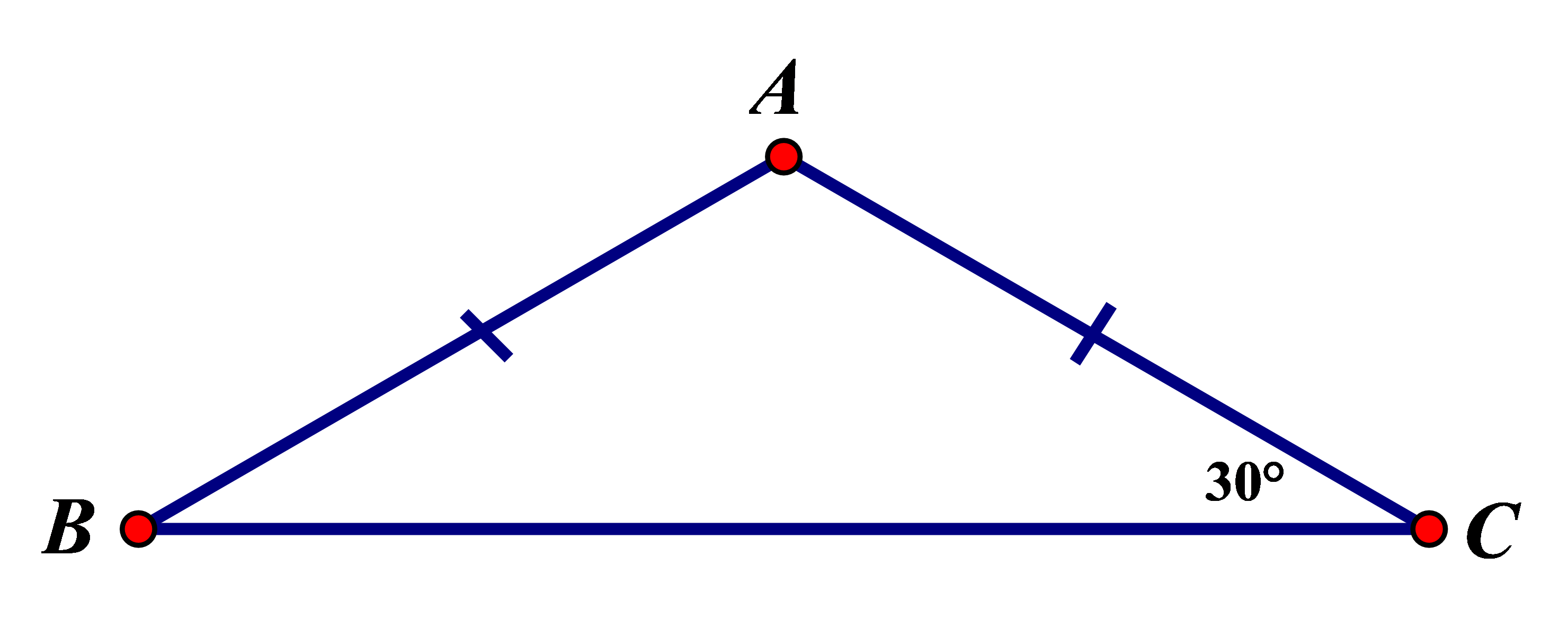 Cho tam giác `ABC` cân tại `A`. Biết `\hat(C)=30^o`. Tính các góc còn lại của tam giác