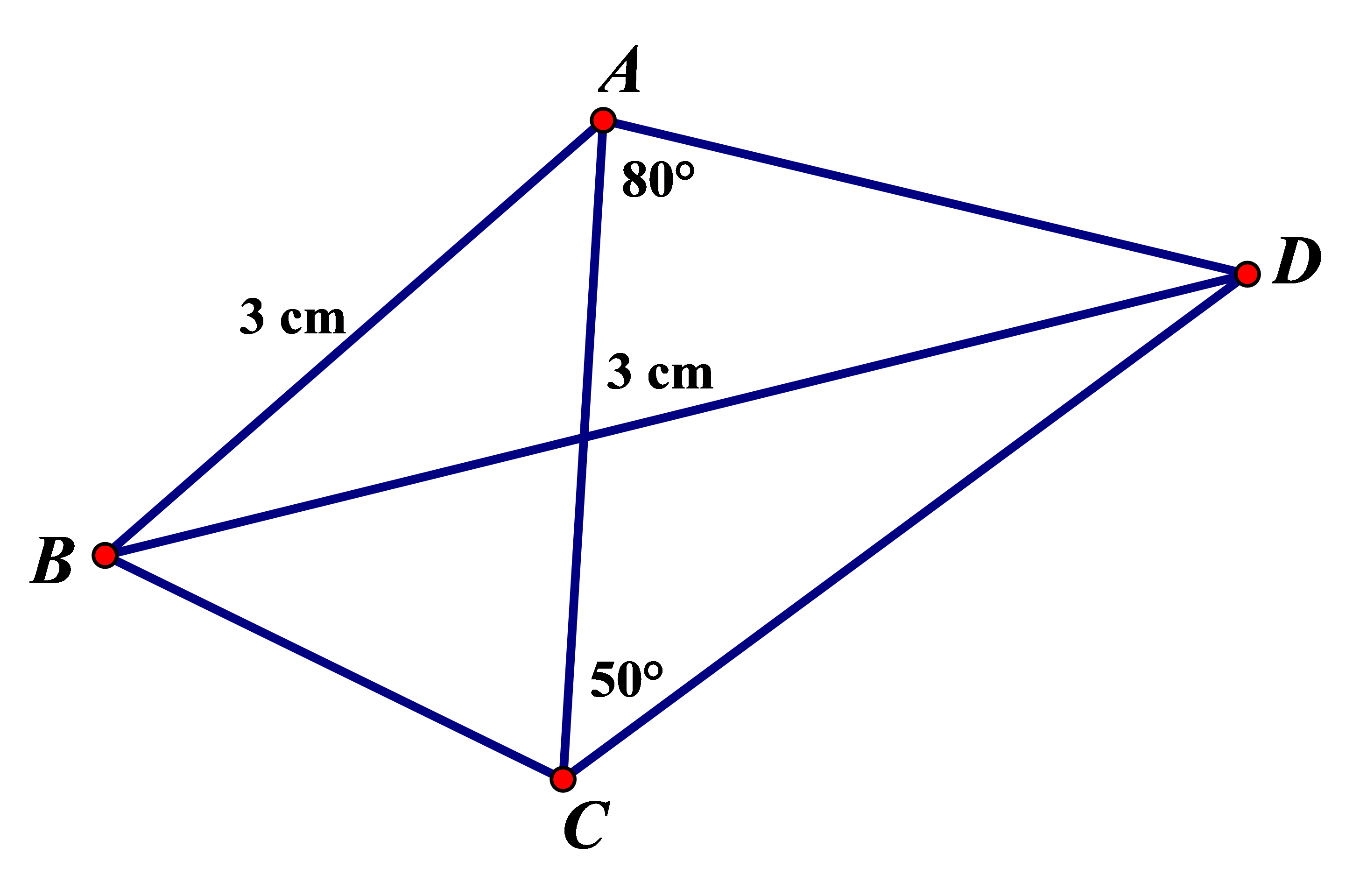 Cho hình vẽ sau. Biết `AB=3cm;AC=3cm;\hat(ACD)=50^o;\hat(CAD)=80^o`