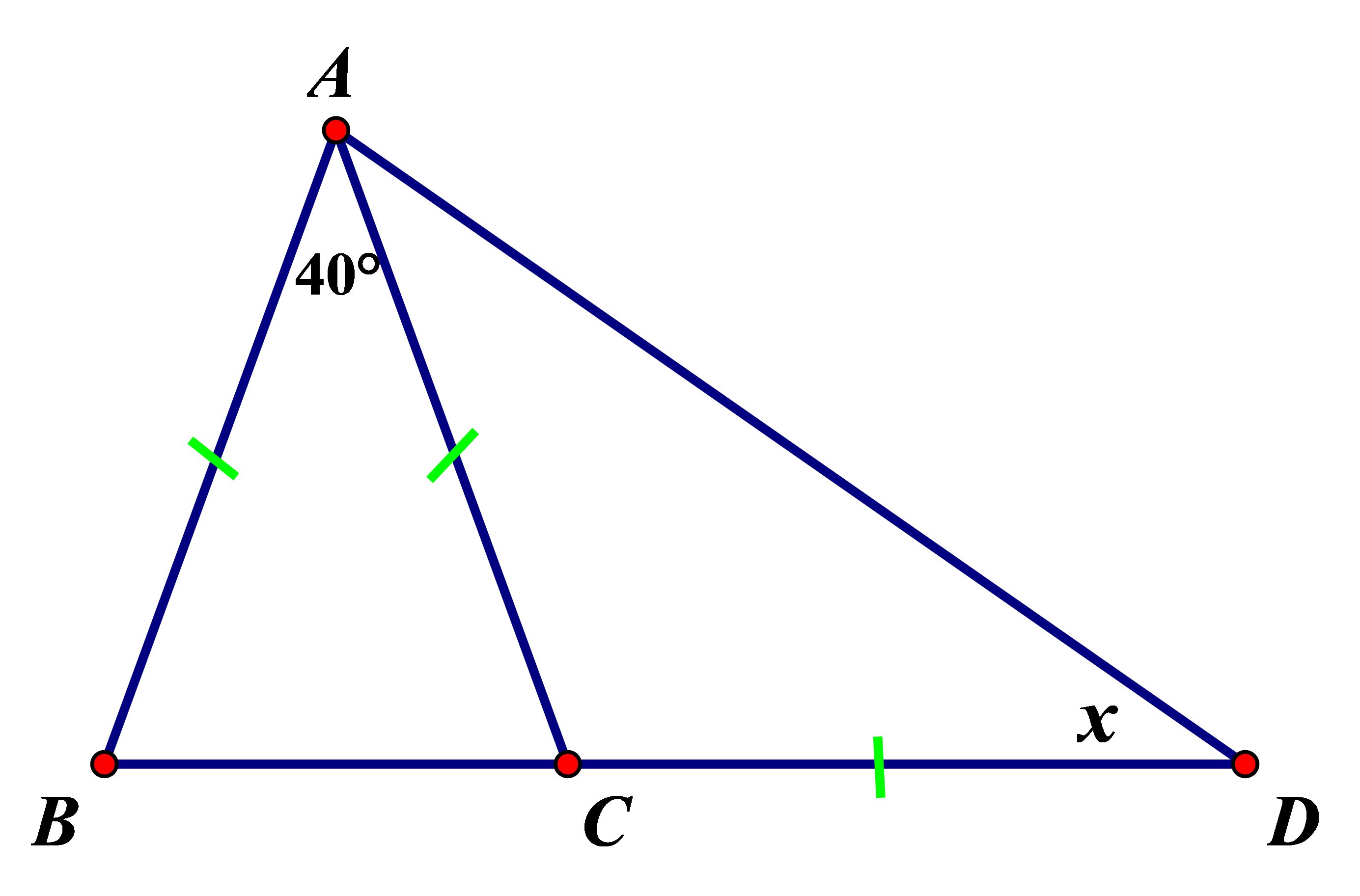 Tam giác `ABC` cân tại `A` (vì `AB=AC`) có `\hat(A)=40^o` nên: