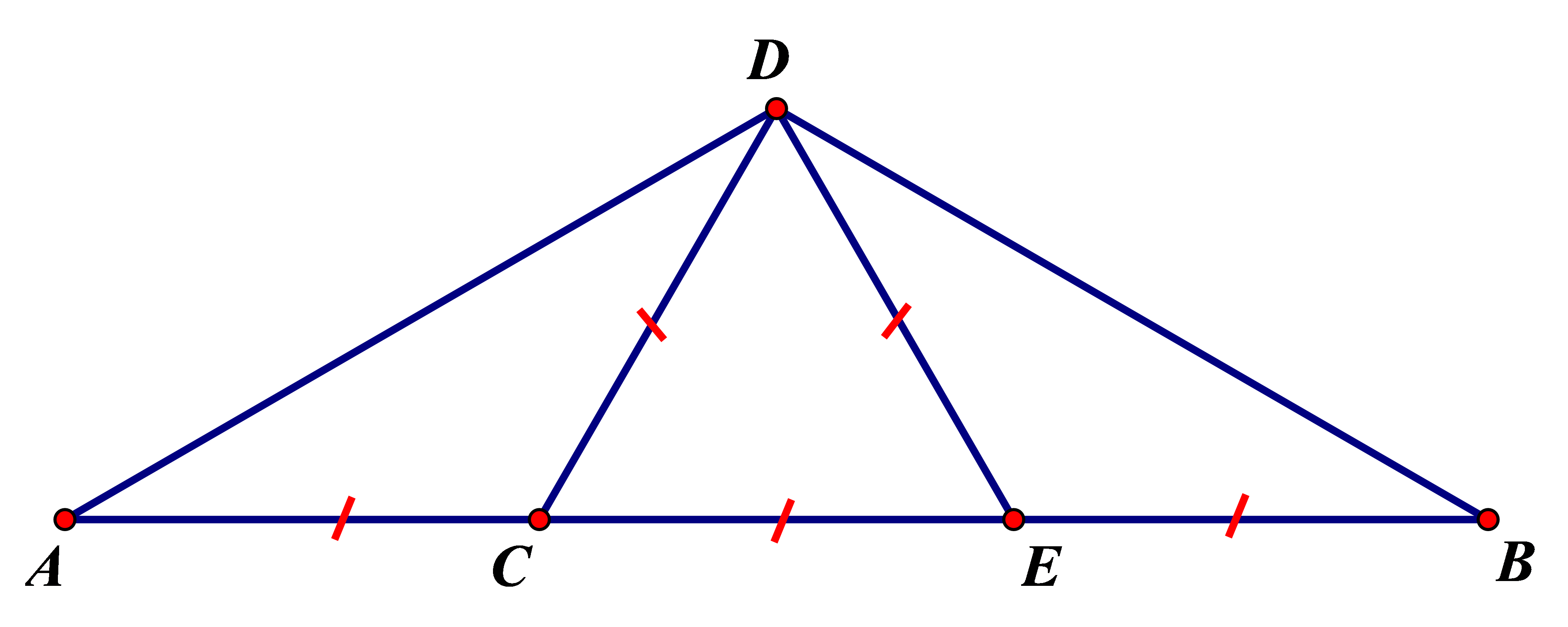 (Tam giác đều: `triangleCDE`; Các tam giác cân: `triangleACE; triangleBED; triangleADB`)