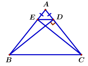 Cho `triangleABC` cân tại đỉnh `A` với `\hat(A)<90^o`. Kẻ `BDbotAC` tại `D`. Trên cạnh `AB`, lấy điểm `E` sao cho `AE=AD`. Chọn khẳng định sai.
