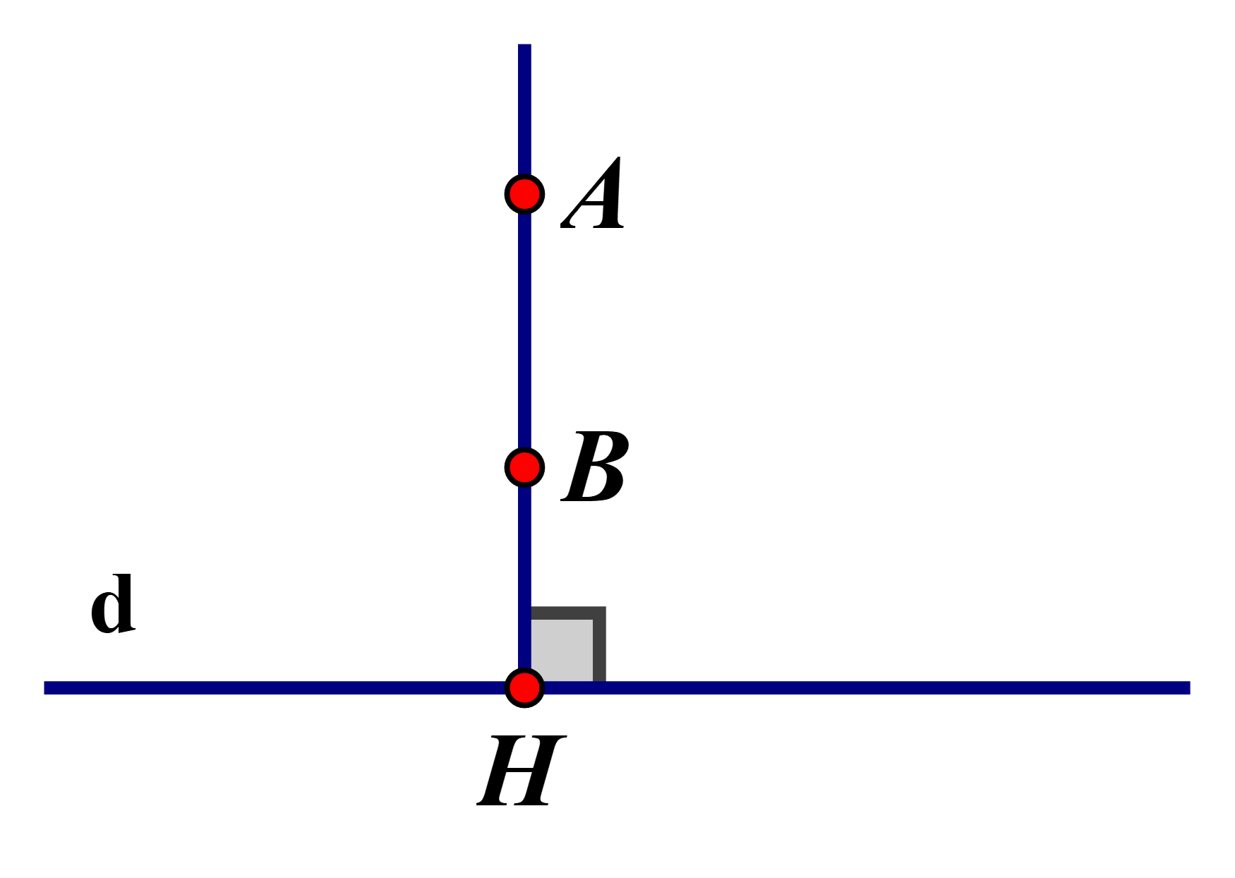 Chẳng hạn trên hình vẽ, điểm `A` và điểm `B` phân biệt có hình chiếu cùng là điểm `H` trên đường thẳng `d`.