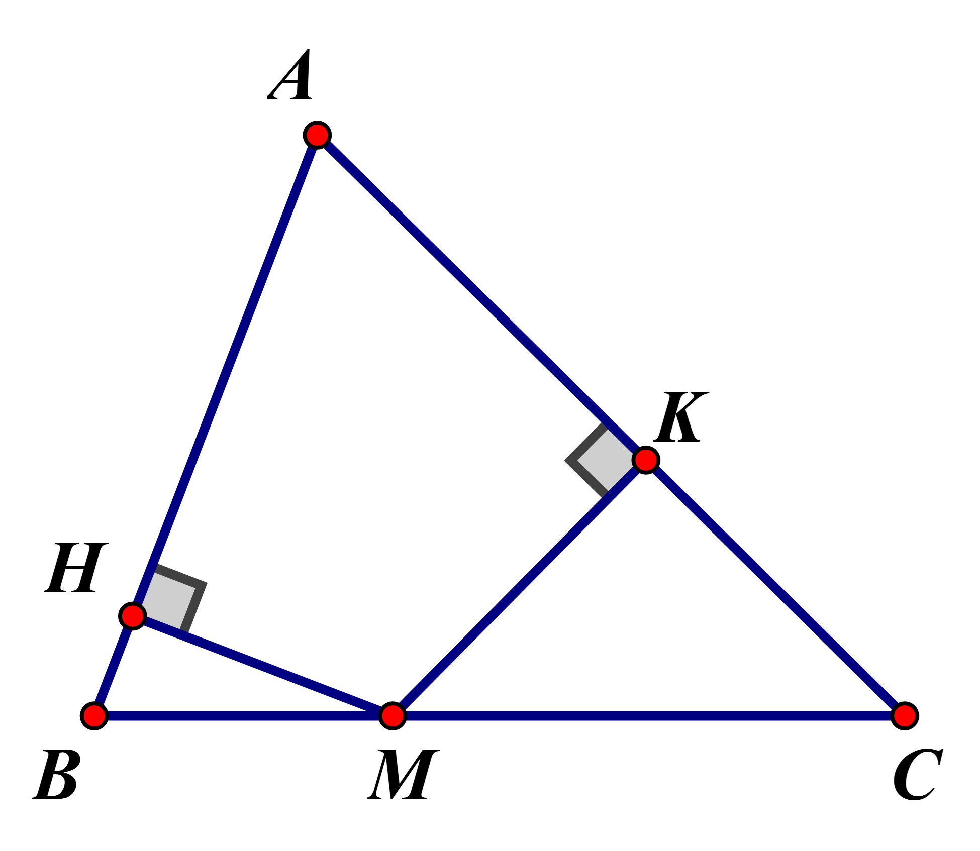 Cho tam giác `ABC`, điểm `M` nằm giữa `B` và `C`. Gọi `H` và `K` là chân các đường vuông góc kẻ từ `M` đến các đường thẳng `AB` và `AC`. So sánh `BC` và tổng `MH+MK`.