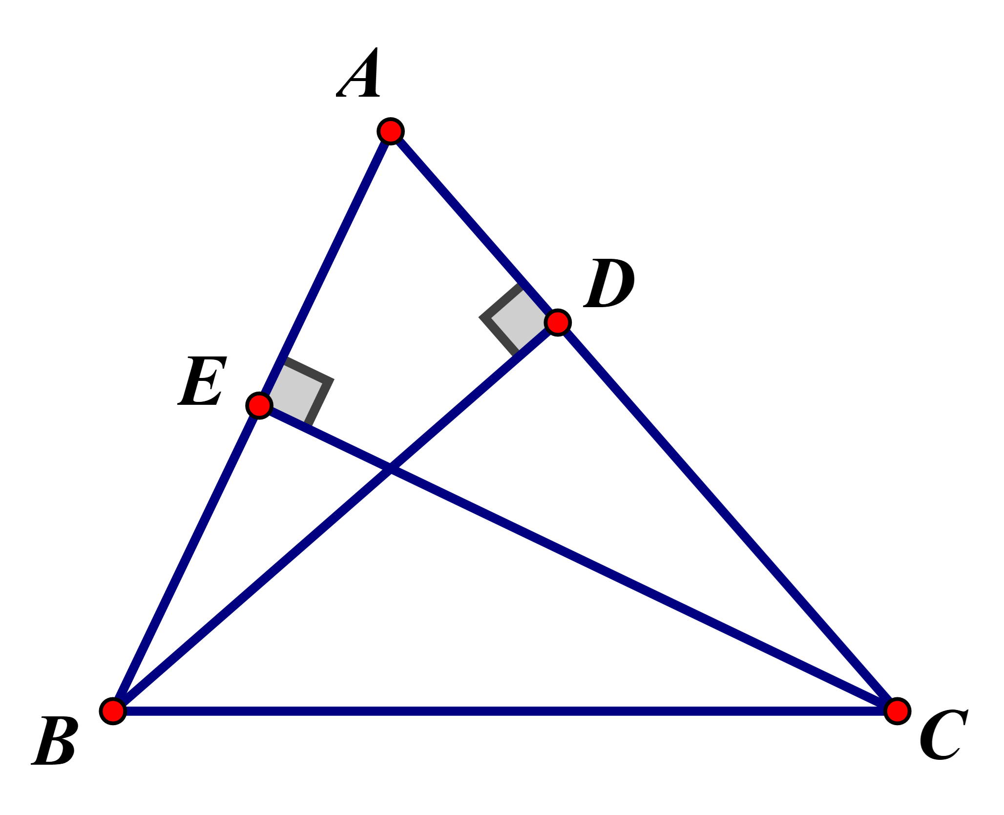 Cho tam giác `ABC` nhọn. Kẻ `BD; CE` lần lượt vuông góc với `AC; AB` tại `D` và `E`. So sánh `BD+CE` và `AB+AC`.