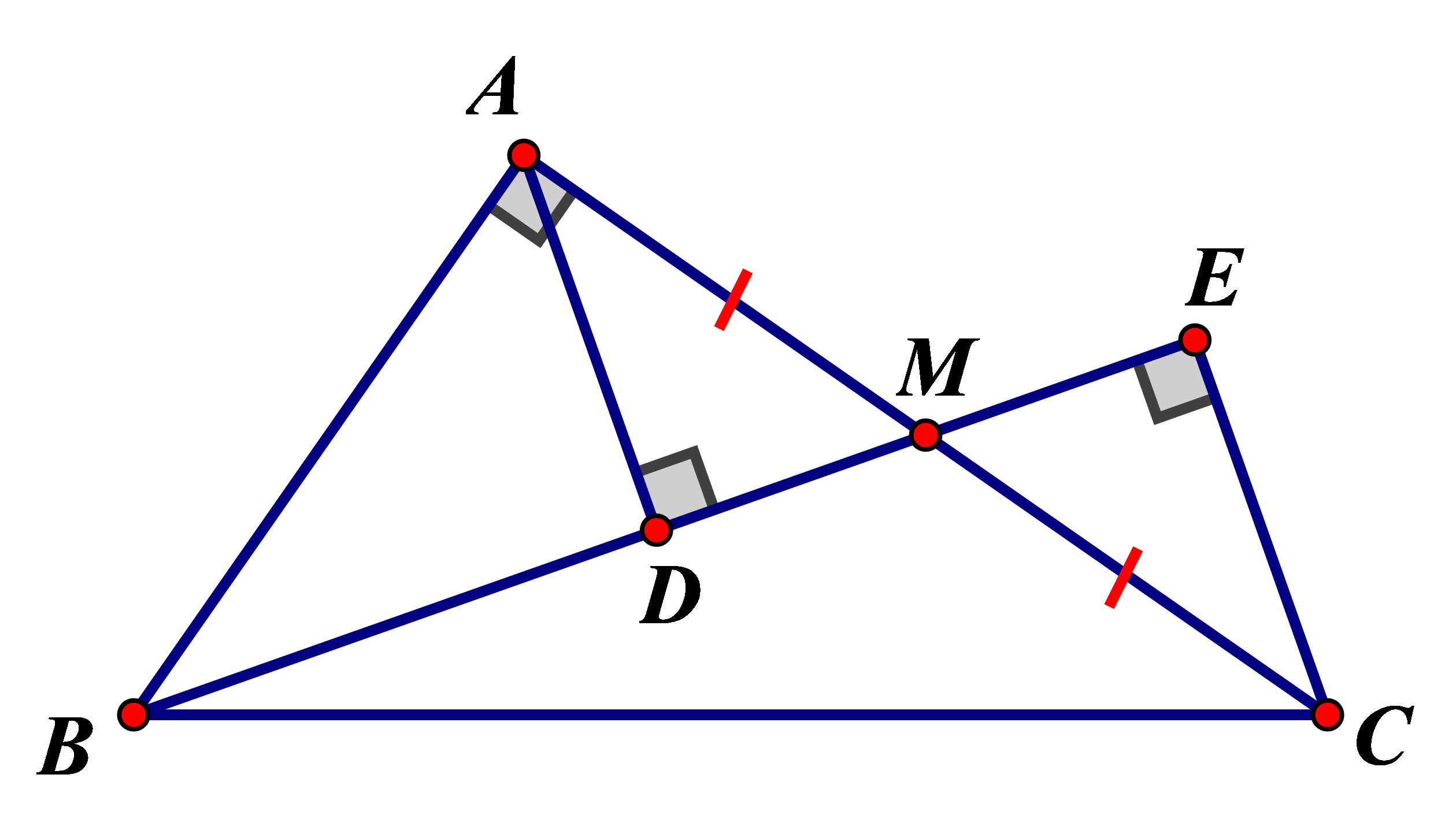 Cho `triangleABC` vuông tại `A`, `M` là trung điểm của `AC`. Gọi `D, E` lần lượt là hình chiếu của `A` và `C` xuống đường thẳng `BM`.