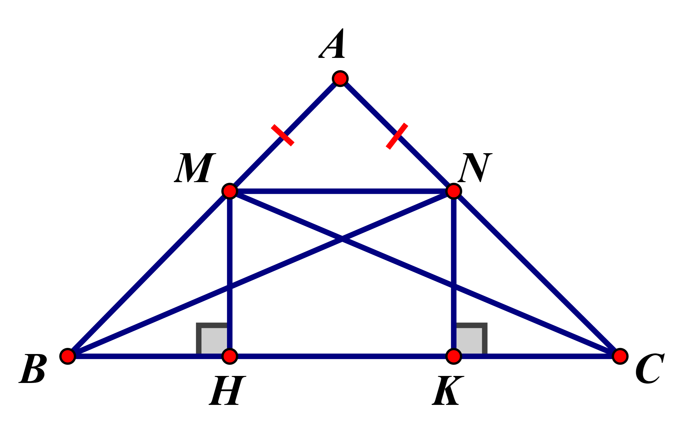 Cho tam giác `ABC` cân tại `A`. Trên hai cạnh `AB` và `AC` lấy điểm `M` và `N` sao cho `AM=AN`. Vẽ `MH bot BC` tại `H`; `NK bot BC` tại `K`.