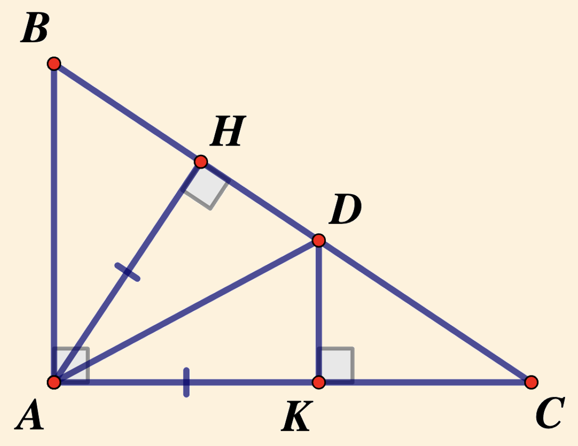 Cho tam giác `ABC` vuông tại `A`, kẻ đường cao `AH`. Trên cạnh `AC` lấy điểm `K` sao cho `AK=AH`. Kẻ `KD bot AC` `(D in AC)`. Chọn khẳng định sai: