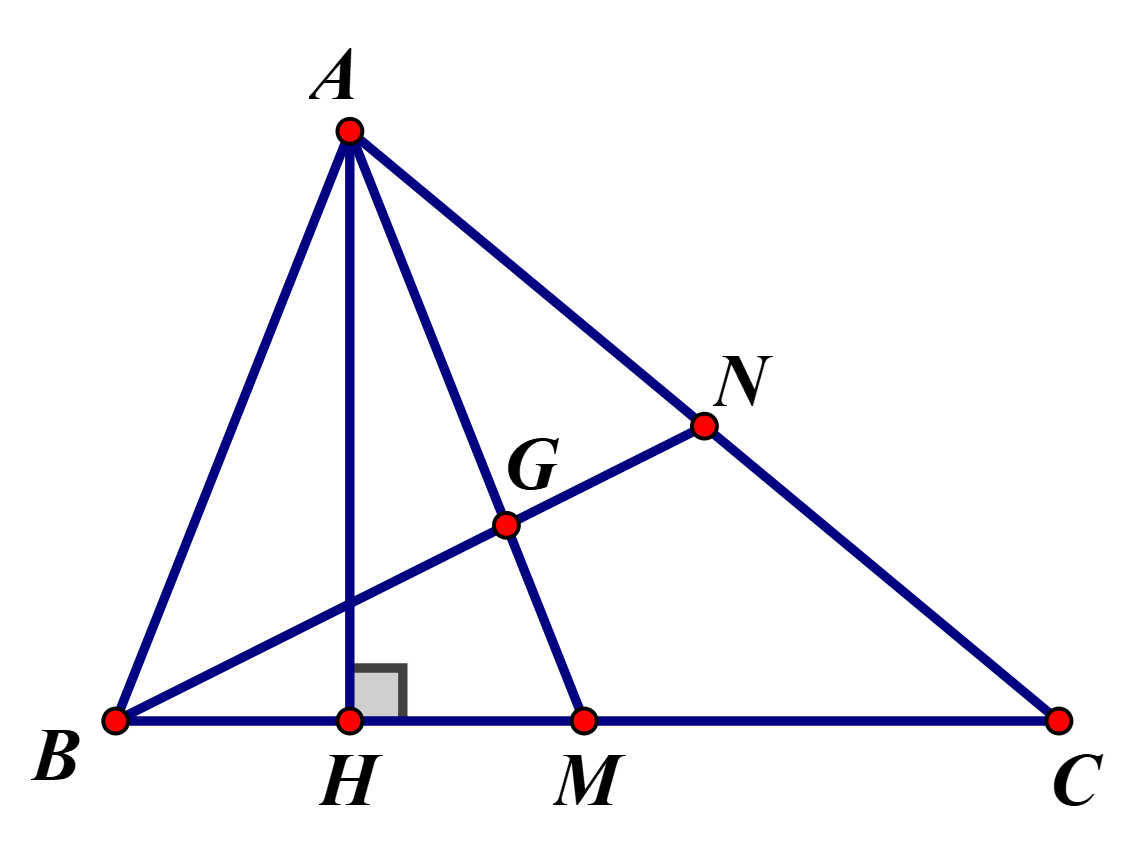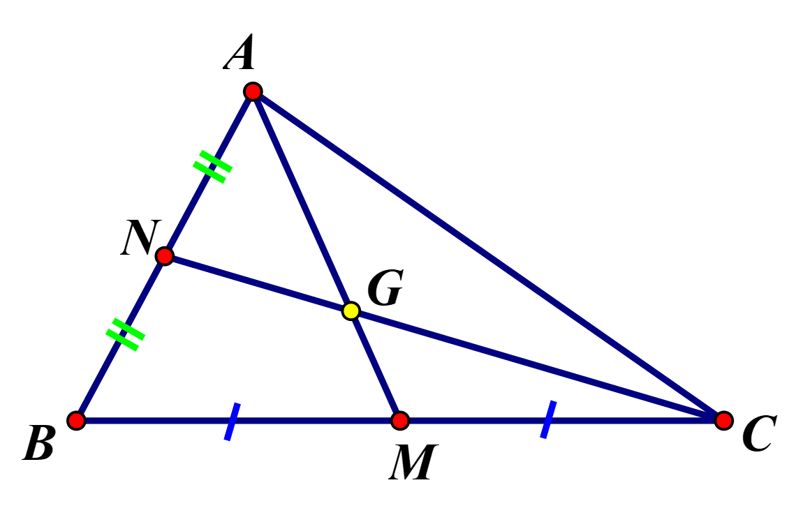 Xét `triangleABC` có hai đường trung tuyến `AM` và `BN` cắt nhau tại `G`