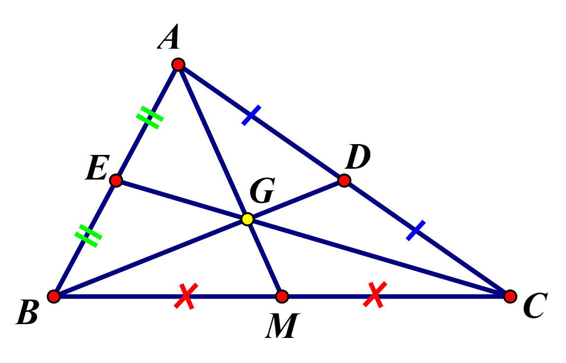Cho tam giác `ABC` có các đường trung tuyến `AM, BD, CE` đồng quy tại `G`. Nhận xét nào sau đây là đúng?