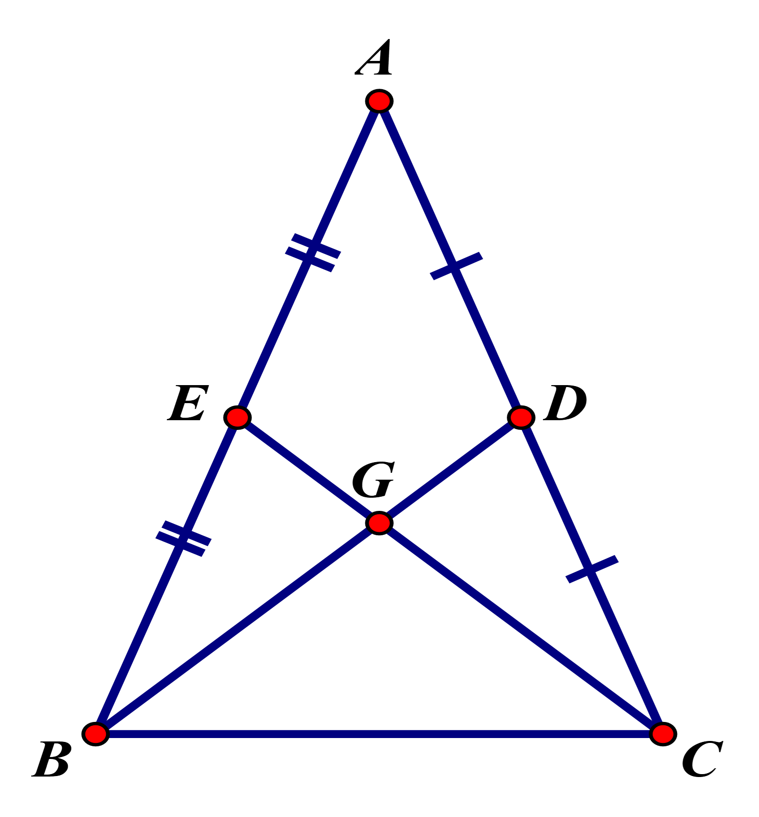 Xét `triangleABC` có các đường trung tuyến `BD; CE` cắt nhau tại `G`