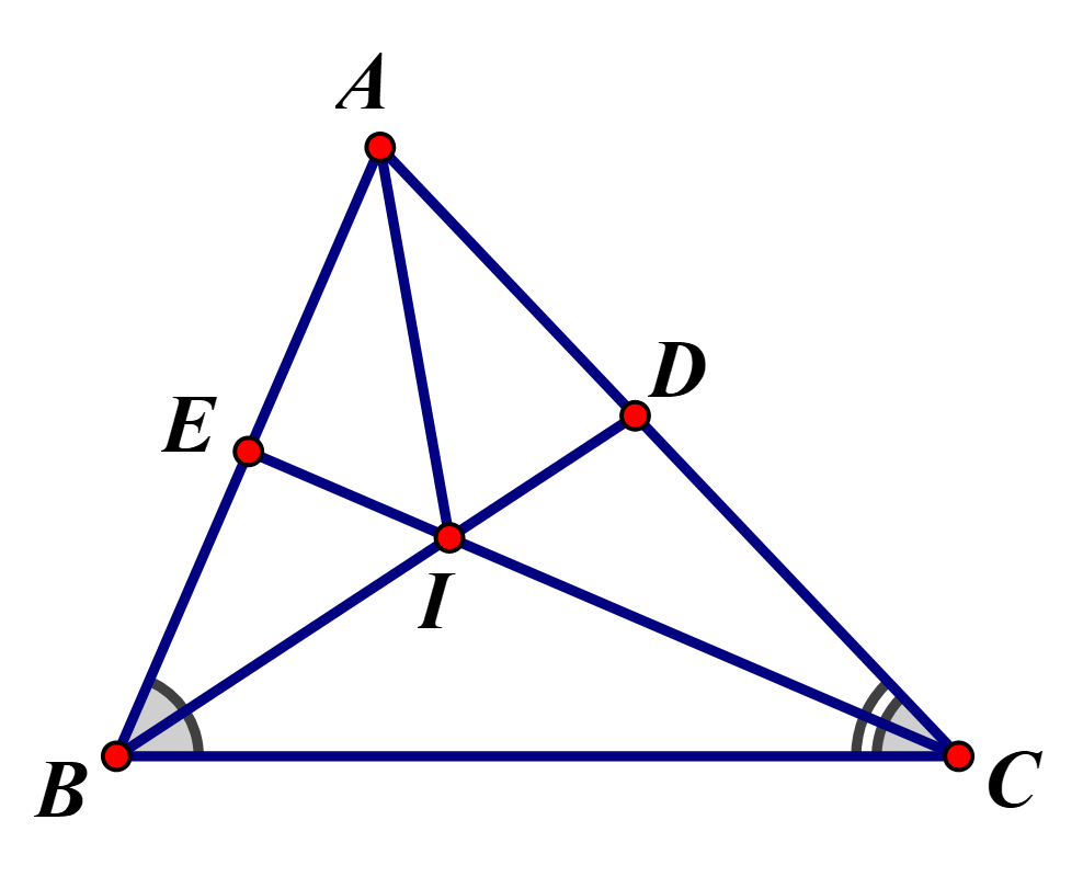 Cho tam giác `ABC` có hai đường phân giác `BD` và `CE` cắt nhau tại `I`. Khi đó: