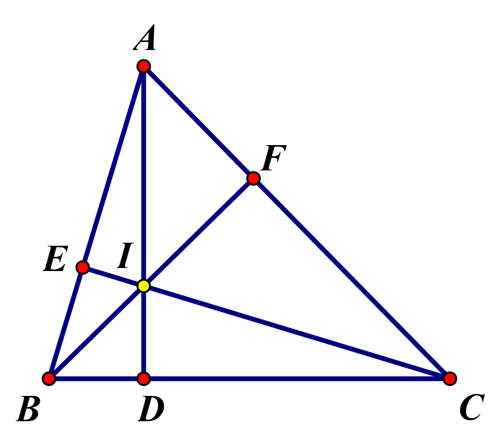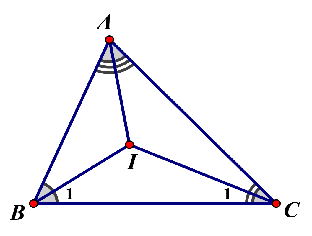 Cho tam giác `ABC` có `I` là giao điểm của ba đường phân giác.