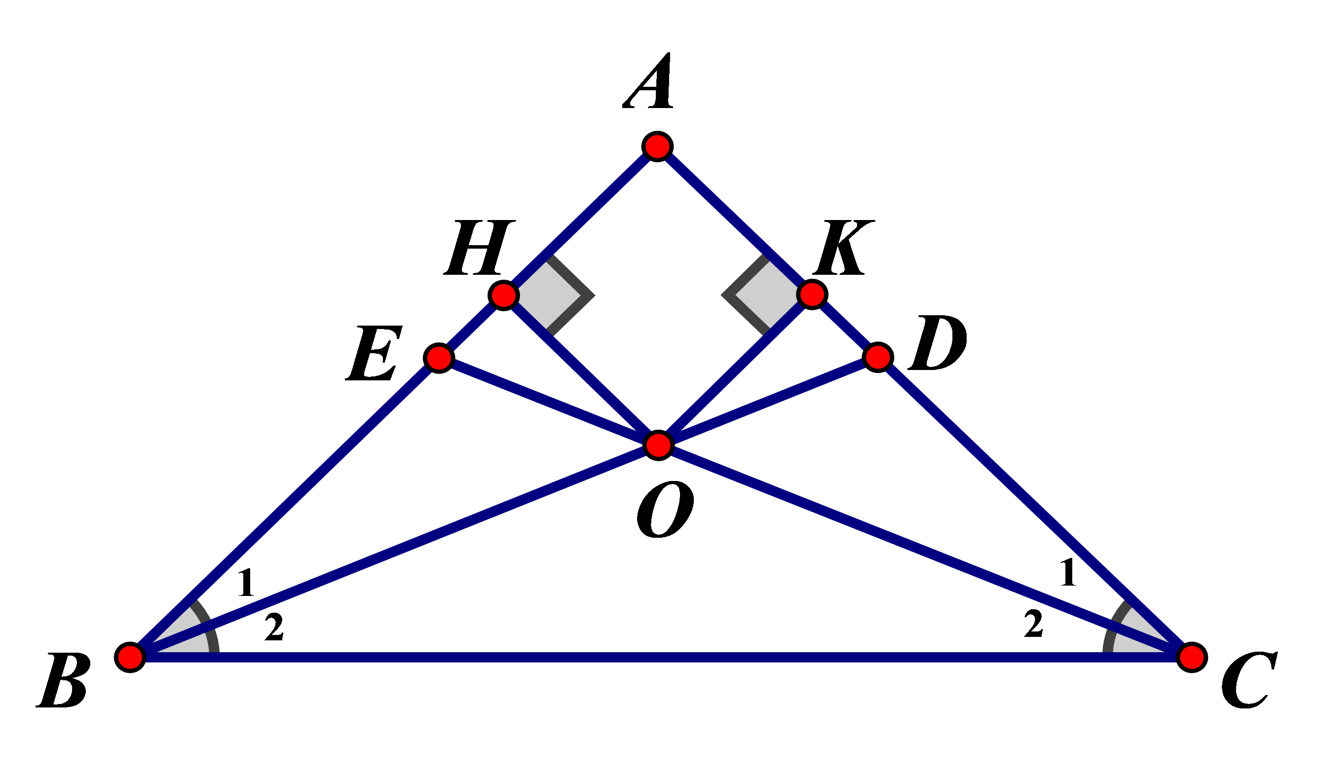 Cho tam giác `ABC` cân tại `A`. Đường phân giác `BD,CE` của góc `B` và `C` cắt nhau tại `O`. Từ `O` kẻ `OH, OK` vuông góc với `AB,AC`.