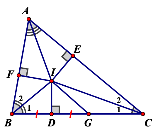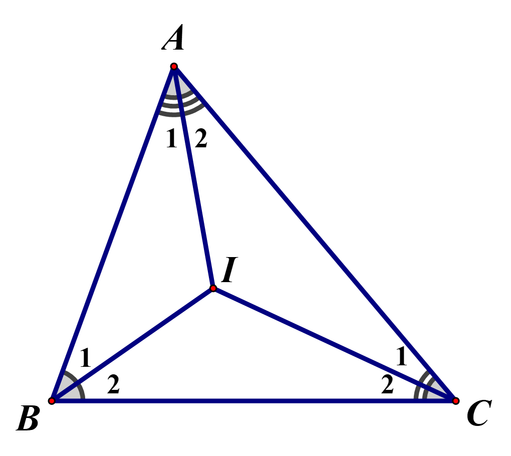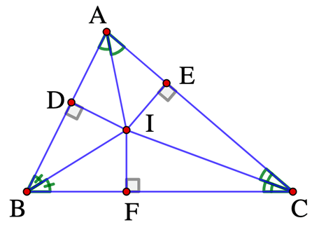 Vì `triangleABC` có `I` là giao điểm của ba đường phân giác