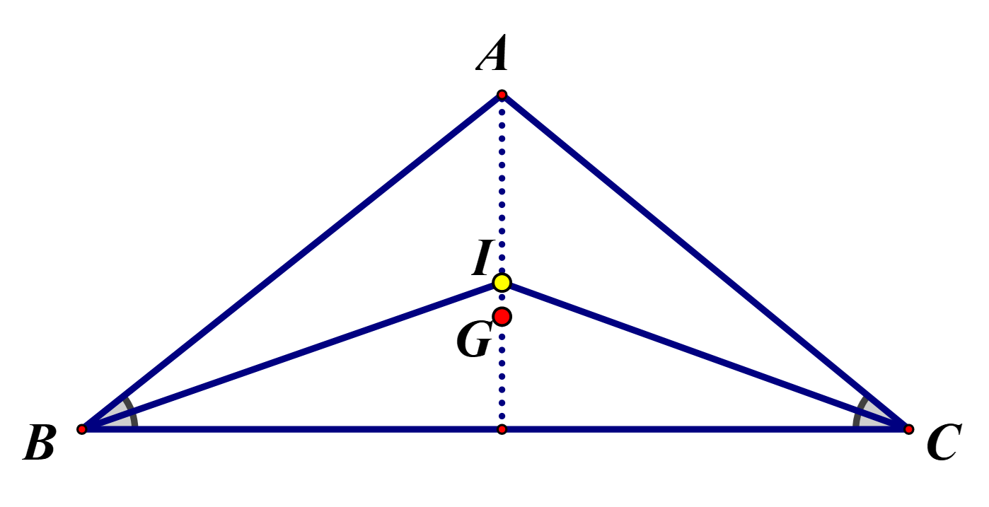 Cho `triangleABC` cân tại `A`. Gọi `G` là trọng tâm của tam giác, `I` là giao điểm của các tia phân giác góc `B` và góc `C` của tam giác.