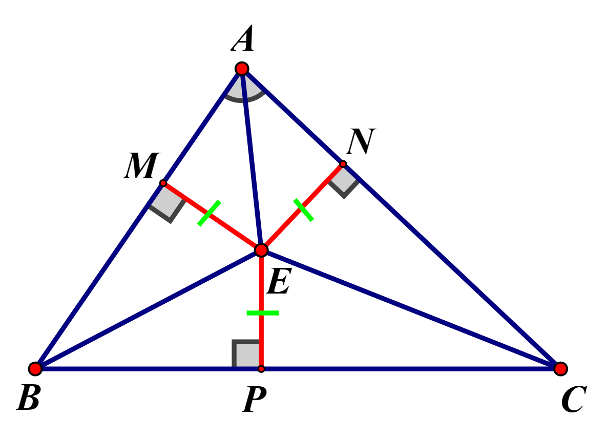 Từ `E` kẻ các đoạn thẳng `EM bot AB; EN bot AC; EP bot BC` `(M in AB; N in AC; P in BC)`