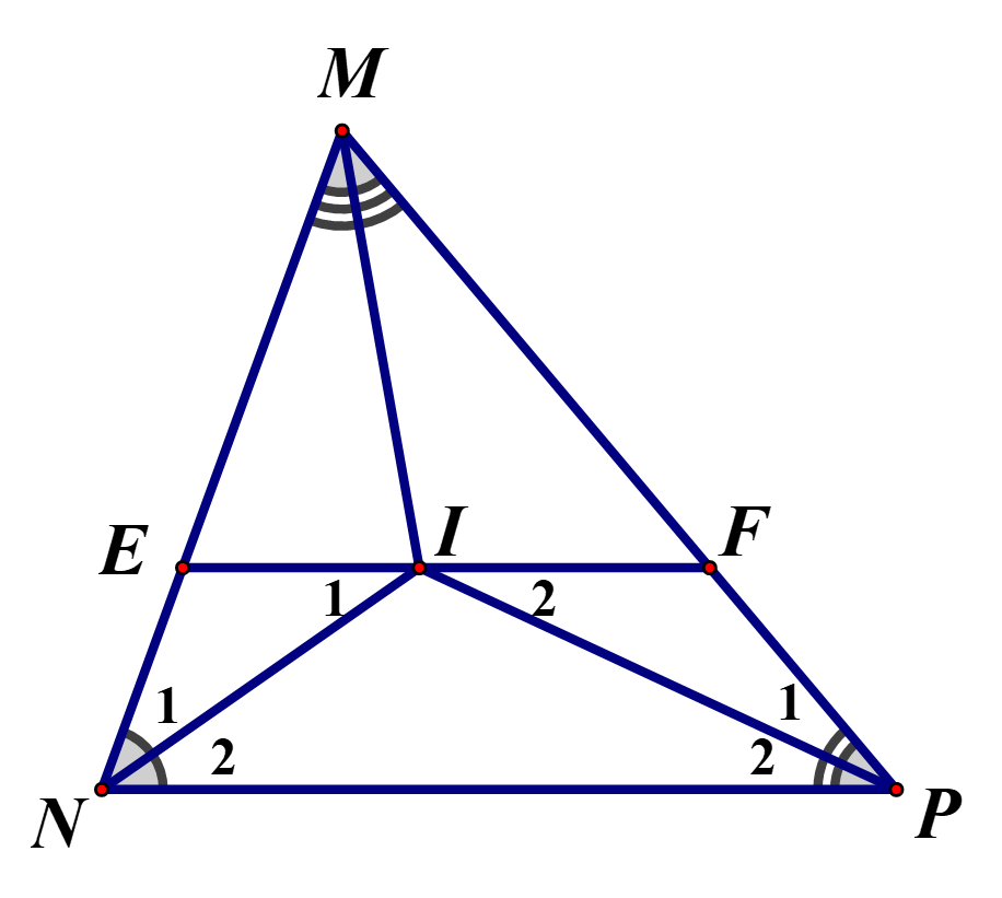 Cho `triangleMNP`, các tia phân giác của góc `M` và góc `P` cắt nhau tại `I`. Qua `I` kẻ đường thẳng song song với `NP` cắt `MN` tại `E`, cắt `MP` tại `F`. Biết `NE=5cm; PF=6cm`, hãy tính độ dài đoạn `EF`.