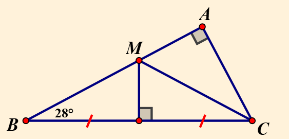 Cho tam giác `ABC` vuông tại `A,hatB=28^o`. Đường trung trực của cạnh `BC` cắt `AB` tại điểm `M`. Tính số đo góc `hat(MCA)`.