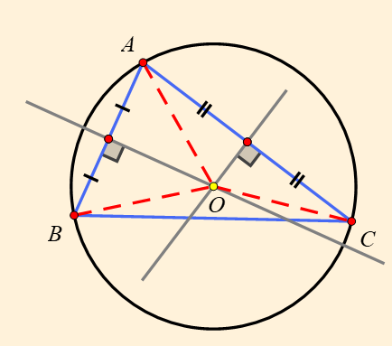 Trong tam giác `ABC`, giao điểm `O` của ba đường trung trực cách đều ba đỉnh nên có một đường tròn tâm `O` đi qua ba đỉnh `A,B,C`. Đó là đường tròn ngoại tiếp `△ABC`.