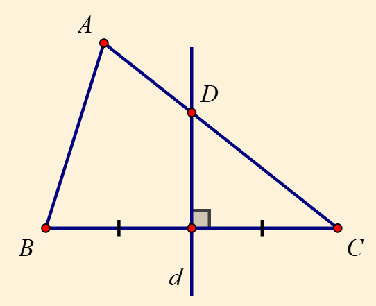 Nếu đường trung trực `d` của cạnh `BC` của `△ABC` cắt cạnh `AC` tại điểm `D` nằm giữa `A` và `C` thì khẳng định nào sau đây là đúng:
