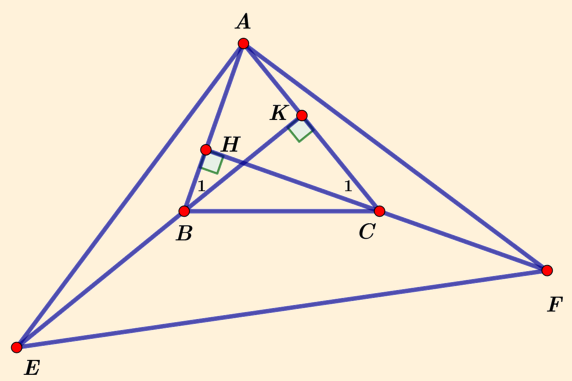 Tam giác `ABC` có góc `A` nhọn, kẻ đường cao `BK` và `CH`. Trên tia đối của tia `BK` lấy điểm `E` sao cho `BE=AC`, trên tia đối của `CH` lấy điểm `F` sao cho `CF=AB`. Cho biết tam giác `AEF` là tam giác gì?