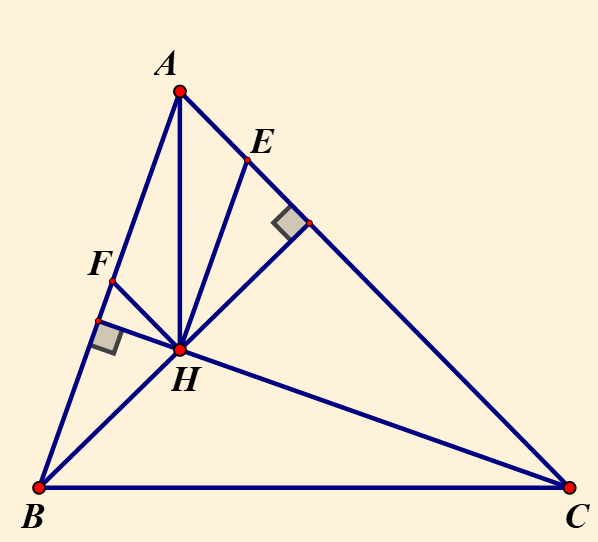 Qua `H` kẻ đường thẳng song song với `AC` cắt `AB` tại `F`, kẻ đường thẳng song song với `AB` cắt `AC` tại `E`