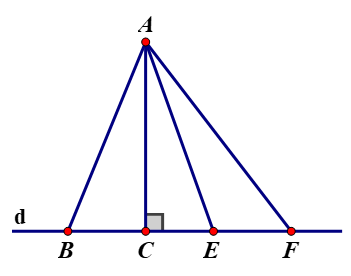 Vì `AC` là đường vuông góc; còn `AB, AC, AF` là các đường xiên kẻ từ `A` xuống đường thẳng `d`