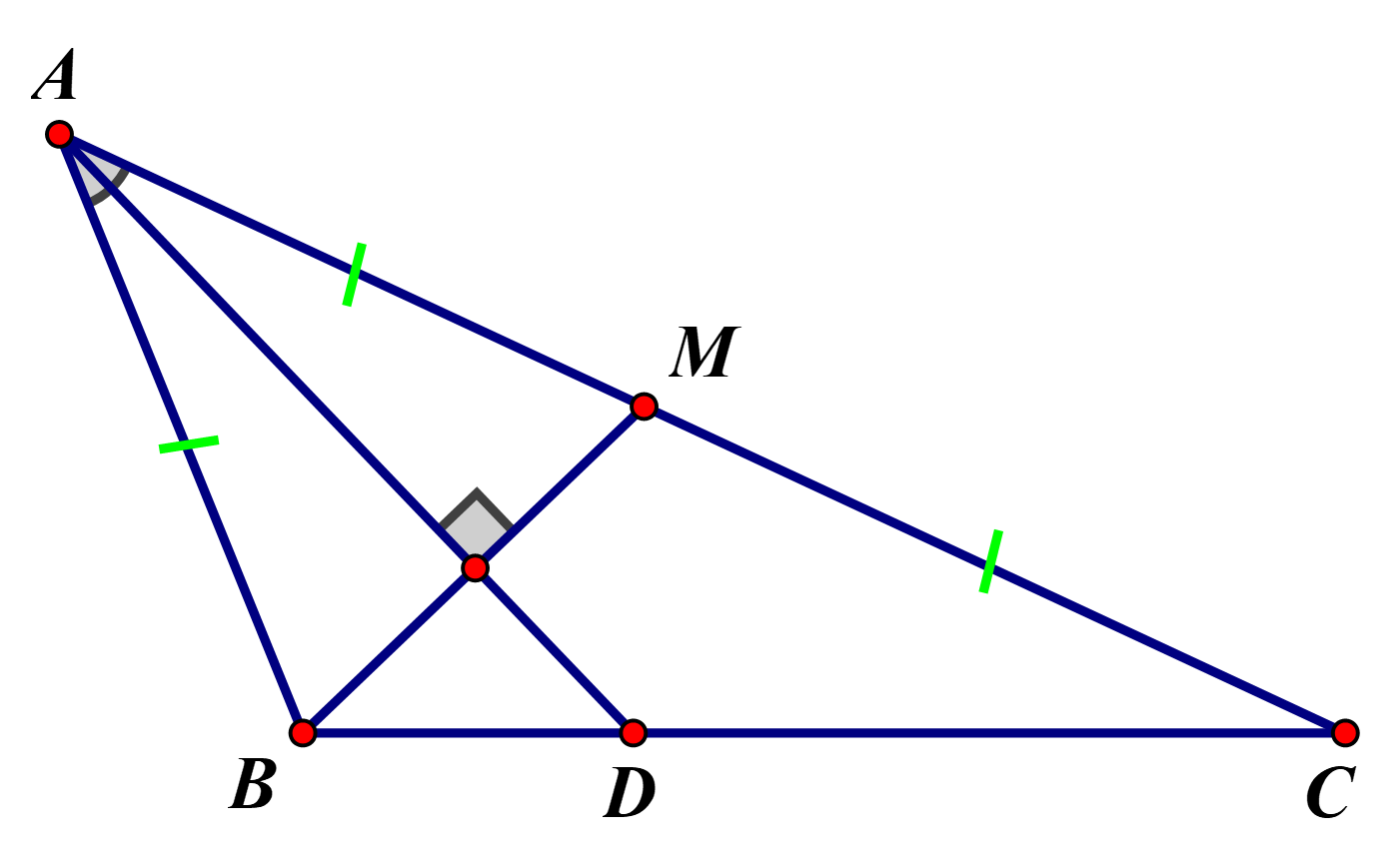 Xét `triangleABM` có đường cao xuất phát từ đỉnh `A` đồng thời cũng là đường phân giác