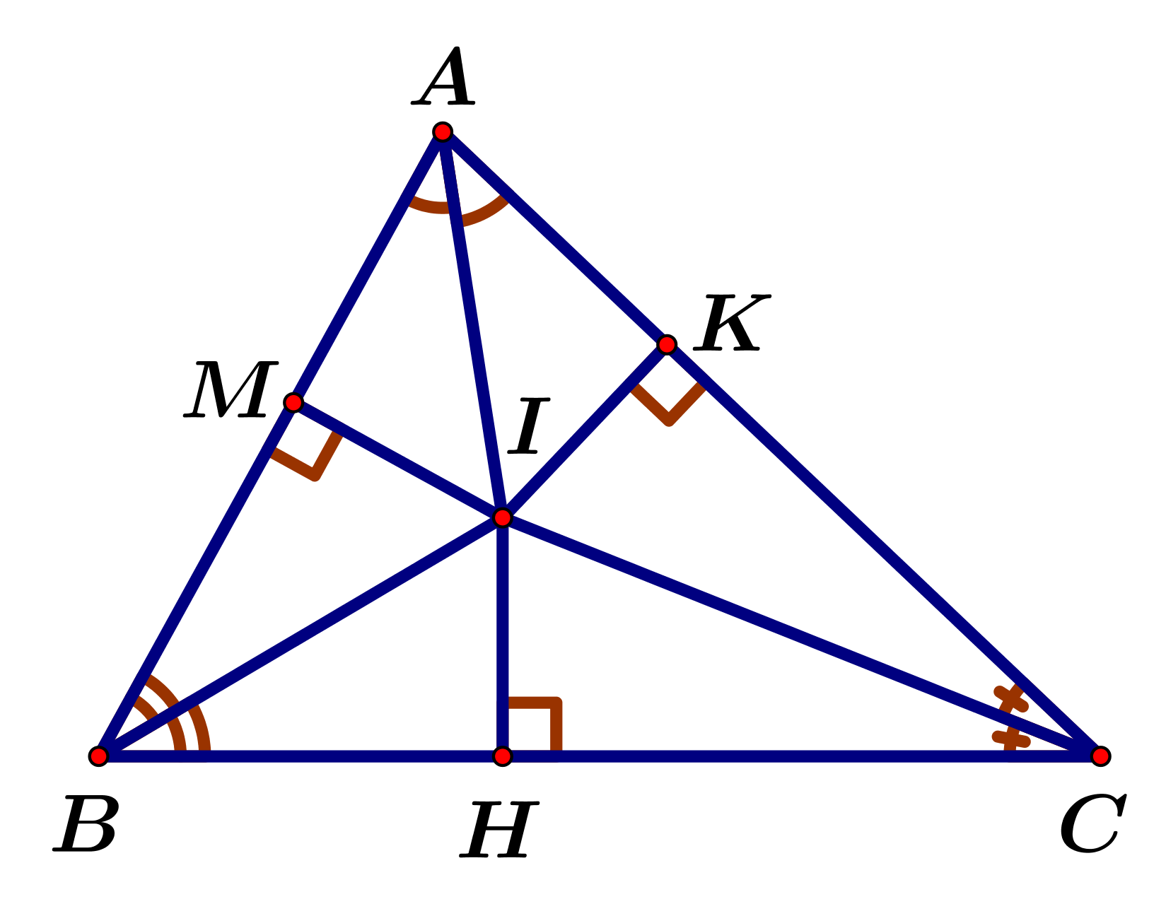 `hat(BMI)=hat(BHI)=90^o` (Vì `IK bot AC` tại `K`; `IM bot AB` tại `M`)