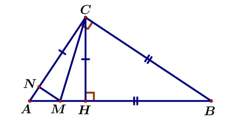 Cho tam giác `ABC` vuông tại `C`, `AC<BC`. Kẻ `CH bot AB`. Trên các cạnh `AB` và `AC` lấy tương ứng hai điểm `M` và `N` sao cho `BM=BC, CN=CH`. So sánh `AC+BC` và `AB+CH`.