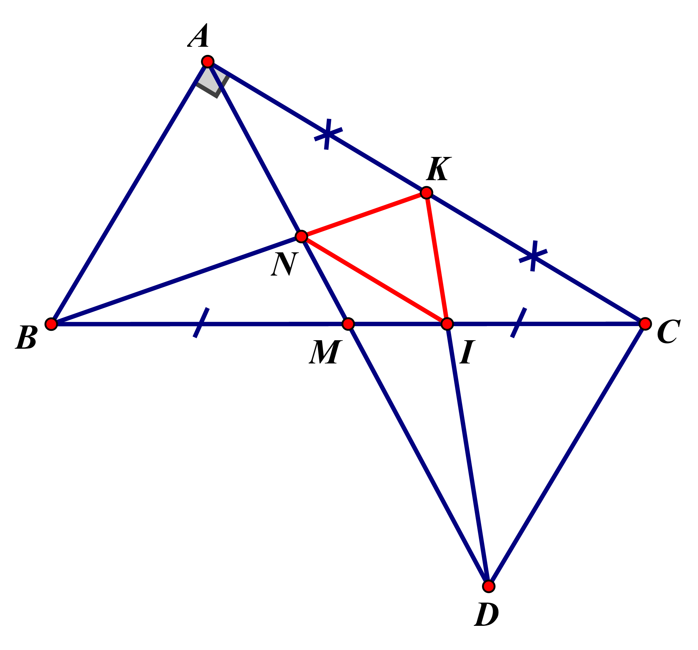Cho tam giác `ABC` vuông tại `A` có `AM` là đường trung tuyến. Trên tia đối của tia `MA` lấy điểm `D` sao cho `MD=MA`. Gọi `K` là trung điểm của `AC`. `KD` cắt `BC` tại `I` và `KB` cắt `AD` tại `N`.