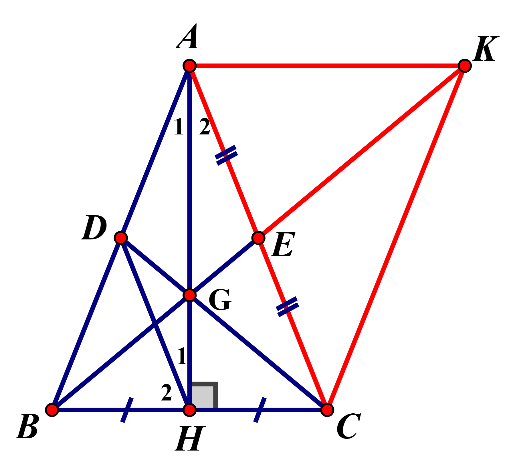 Cho tam giác `ABC` có `AB=AC`, kẻ `AH` vuông góc với `BC` `(H in BC)`. Từ `H` kẻ đường thẳng song song với `AC`, cắt `AB` tại `D`. Gọi `G` là giao của `CD` và `AH`.