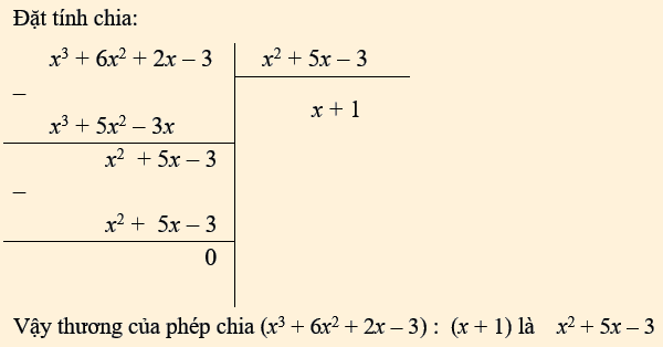 Tìm thương của phép chia `(x^3 + 6x^2 + 2x - 3) : (x + 1)`