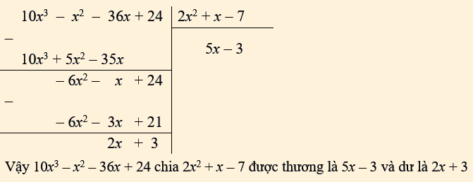 Chia `10x^3 - x^2 - 36x + 24` cho `2x^2 + x - 7` được thương và dư theo thứ tự là: