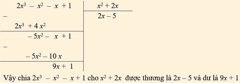 Chia `2x^3 - x^2 - x + 1` cho `x^2 + 2x` được thương và dư theo thứ tự là: