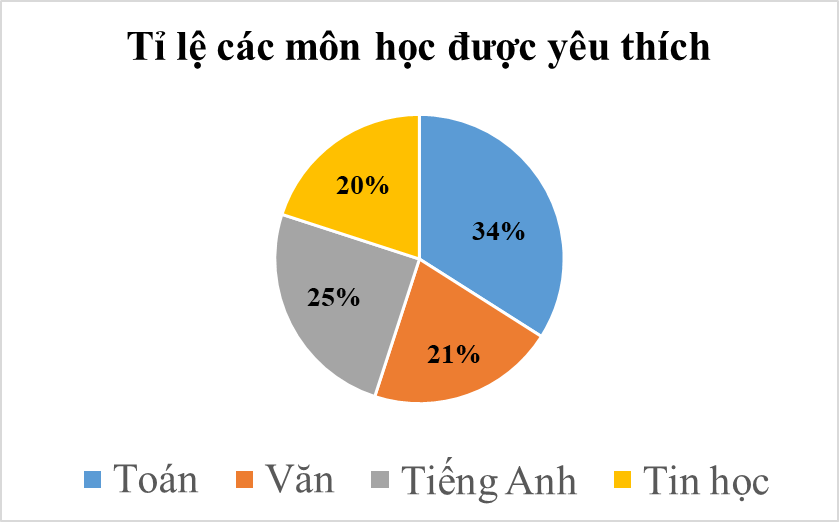 Biểu đồ hình quạt tròn dưới đây biểu diễn kết quả thống kê về môn học ưa thích nhất trong môn: Toán, Văn, Tiếng Anh, Tin Học của học sinh một trường THCS (mỗi học sinh chỉ được chọn một môn khi hỏi ý kiến