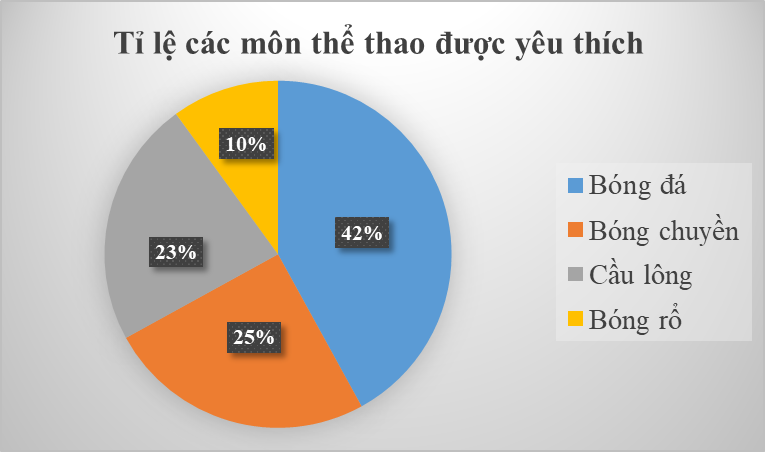 Biểu đồ hình quạt tròn dưới đây biểu diễn kết quả thống kê (tính theo tỉ số `%`) chọn môn thể thao ưa thích nhất: bóng đá, bóng chuyền, cầu lông, bóng rổ của `500` học sinh khối `7` một trường THCS. Mỗi học sinh chỉ được chọn một môn thể thao khi được hỏi ý kiến.