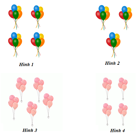 Dựa vào phép tính `5 xx 4 = 20`, ta biết được mỗi chùm bóng có `5` quả, có `4` chùm bóng như thế.