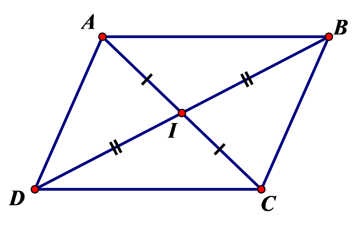 Cho hình bình hành `ABCD.` Gọi `I` là giao điểm của hai đường chéo `AC,BD.` Chọn khẳng định đúng trong các khẳng định sau